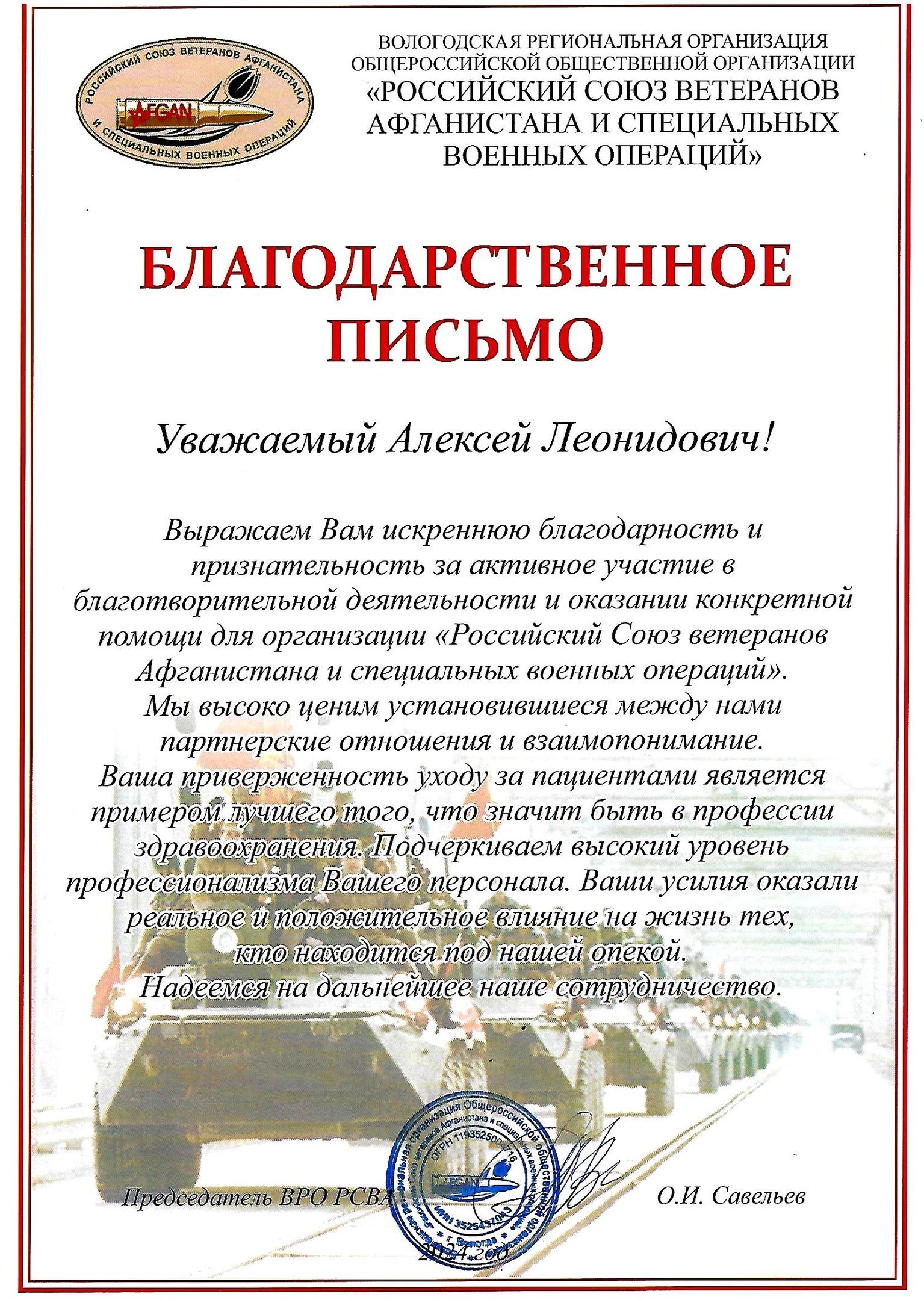 Вот такие слова благодарности в адрес директора и персонала санатория за помощь участникам СВО мы получили от председателя ВРО ООО «Российский союз ветеранов Афганистана и специальных военных операций» (г. Вологда) - О.И. Савельева: