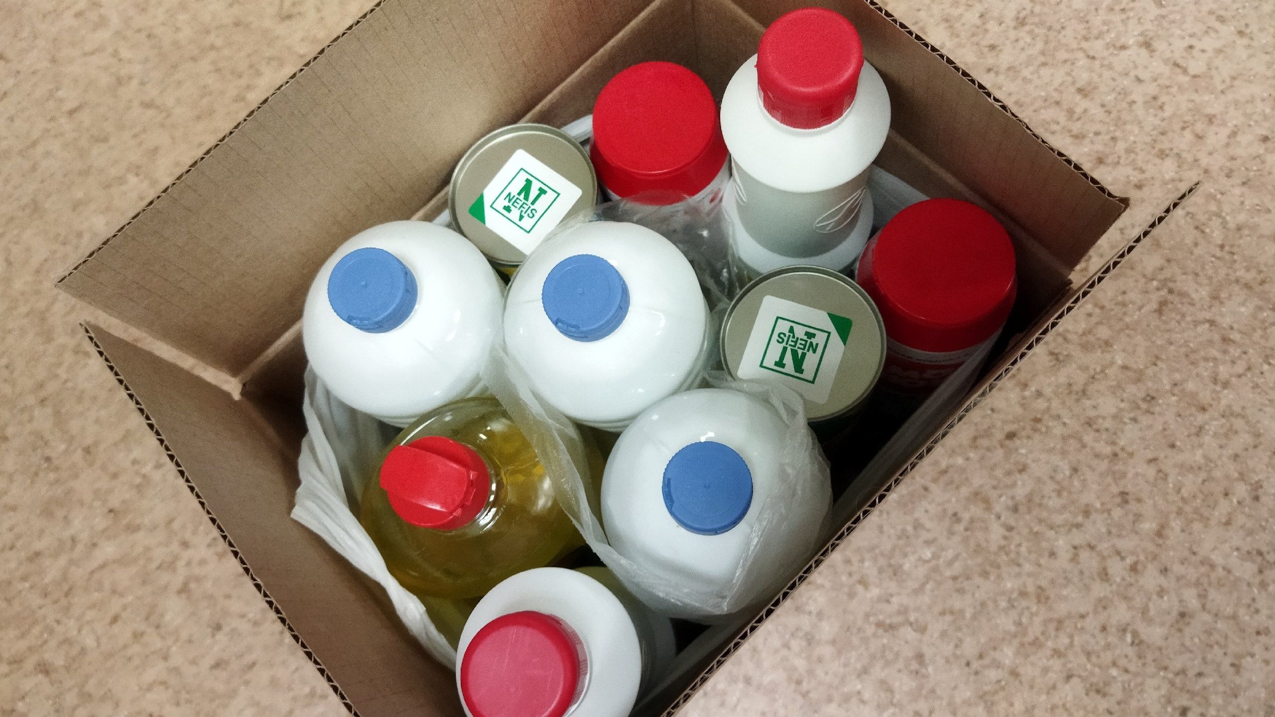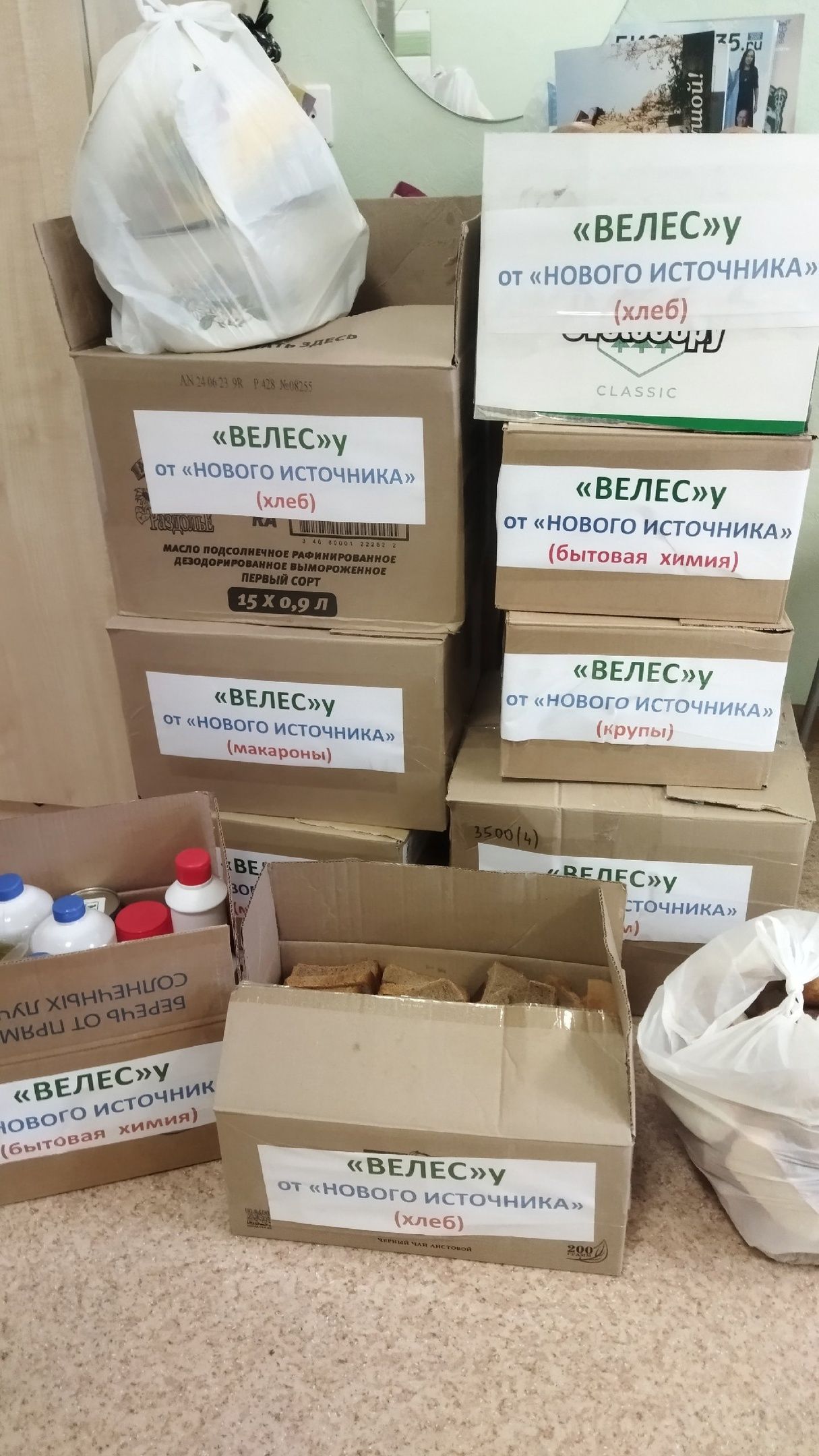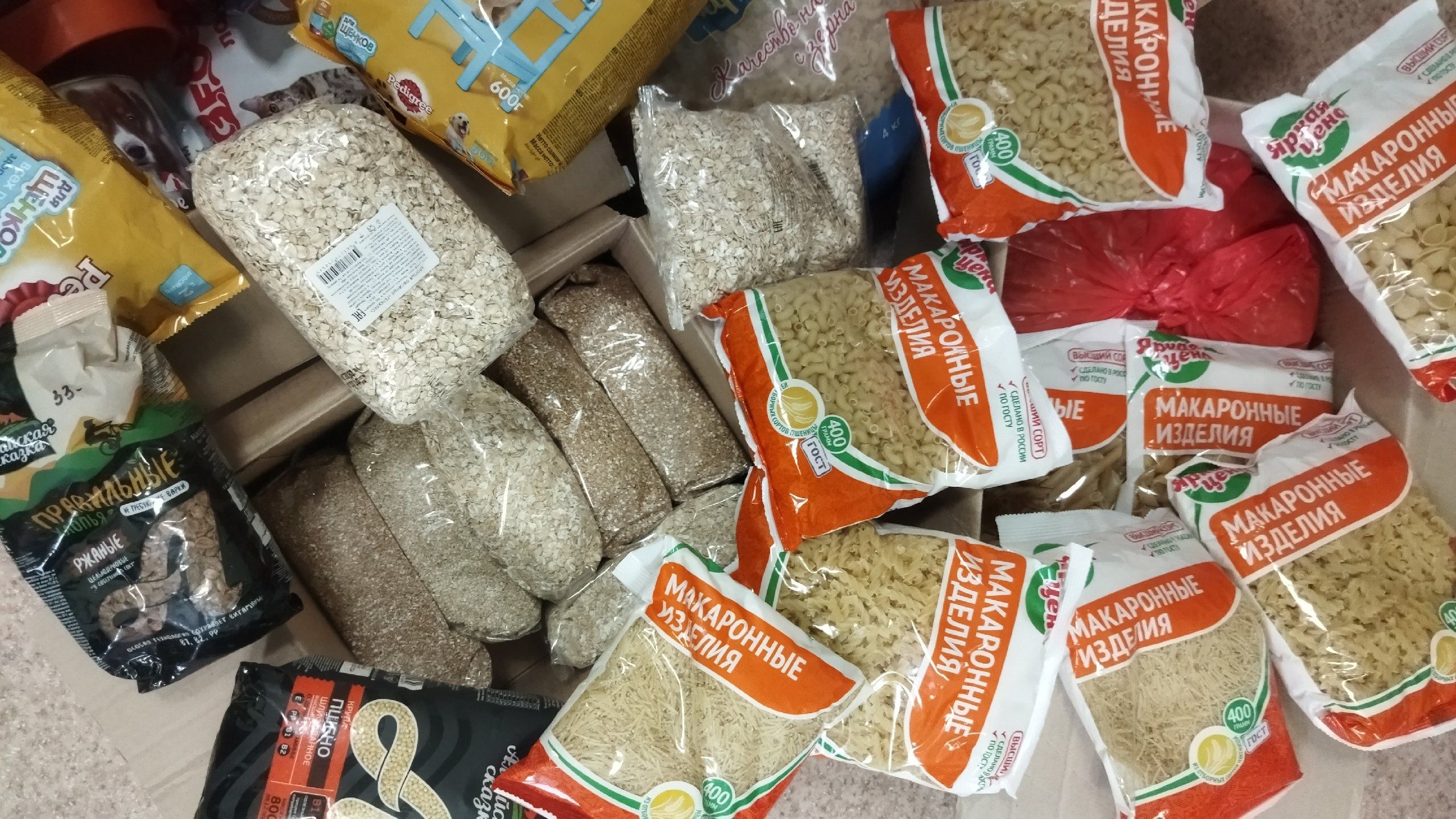 - для животных, где были собраны: крупы, макароны, консервы, бытовая химия (печатки, мешки для мусора, белизна и др.), жидкий и сухой корм, наполнители для туалета, миски для еды, сухари и много разной мелочи. Все это было упаковано в 10 коробок и передано в "ВЕЛЕС" Общество защиты животных г. Вологда;
